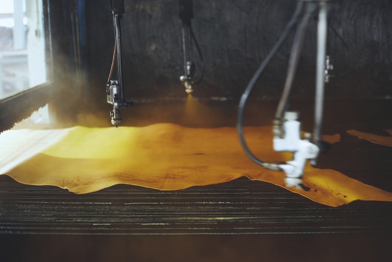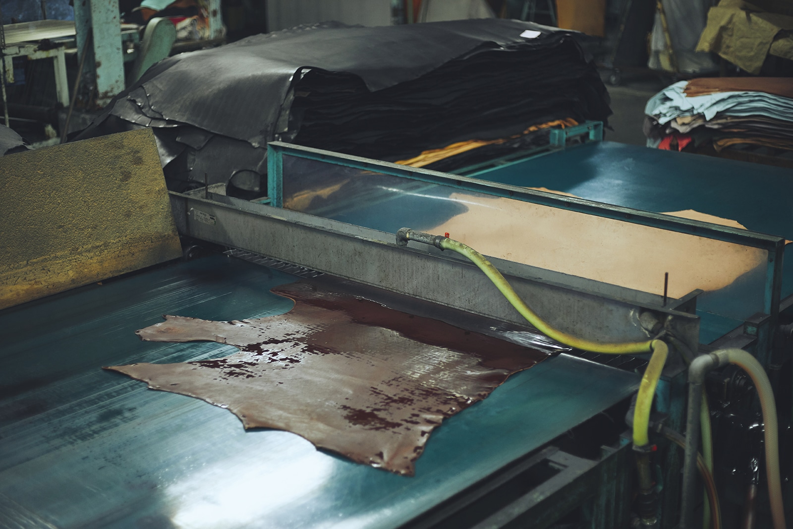 一年を通じて安定したクオリティを供給するため、春夏秋冬の中で気温や湿気に合わせて革を完成させます。ドラムを使った鞣し、スプレーマシンによる染色などは、決まったレシピはあるものの、最終的な仕上げは職人が培った経験と勘。コンディションに左右されず、常に上質なレザーが生産されています。「PLATEAU」のオリジナルレザーは“ショートクロム鞣し”を採用。“ウェットブルー”と呼ばれるクロム鞣しを施した後の湿潤な状態の革に、植物タンニンを用いて二次加工。特殊なコンビネーションによる技法によって、クロム鞣しならではの耐久性、植物タンニンらしい風合いが見事に兼備されています。