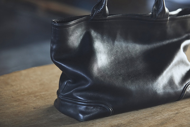写真は、富田興業の森田正明さんが3年ほど使用したWEEKEND TOTE。美しいフォルムをしっかりとキープしながら、革ならではのクタッとした表情に。そしてシボ模様とともに艶感が出ているのも特徴的。「傷が付きにくくて雨に濡れても安心。お手入れフリーで使いやすいのが嬉しいですね」と、オンオフ問わずにこのバッグを持ち歩いているそうです。芯材を取り除いたハンドルは肩の形状に変化し、優しくフィットして肩からずり落ちることがありません。「革を擦ると『キュッキュッ』と鳴くんですが、これは使っている素材が上質な証拠。レザー好きを惹きつけて止まないバッグです」と森田さん。 -