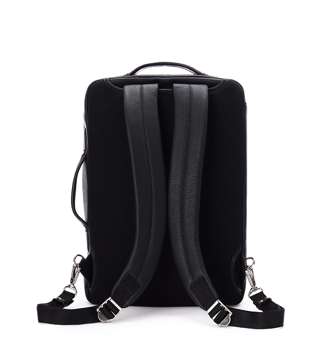横にもってブリーフケースとして使用する時は、リュックの肩ベルトは背面ポケットにスッキリ収納できる仕様です。