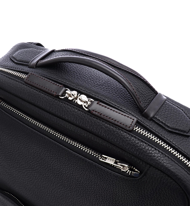 上品なシボを揃えた国産シュリンクレザー。技術力に定評のある姫路のタンナーが手掛けた革は立体的な弾力とハリを持ち、曲げ伸ばしの耐久性にも優れています。表面は傷が目立ちにくく、色落ちや褪色を防ぎ長く使っても上品さをキープする特徴があります。常に触れるハンドルには、部位から厳選した厚口のオイルレザーを採用し耐久性を高めています。使うほどに味わいを増し手に馴染みます。