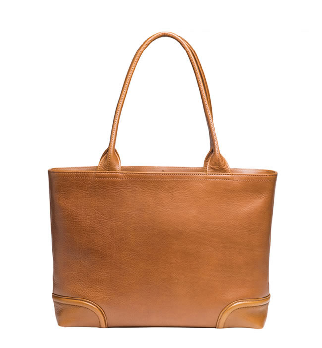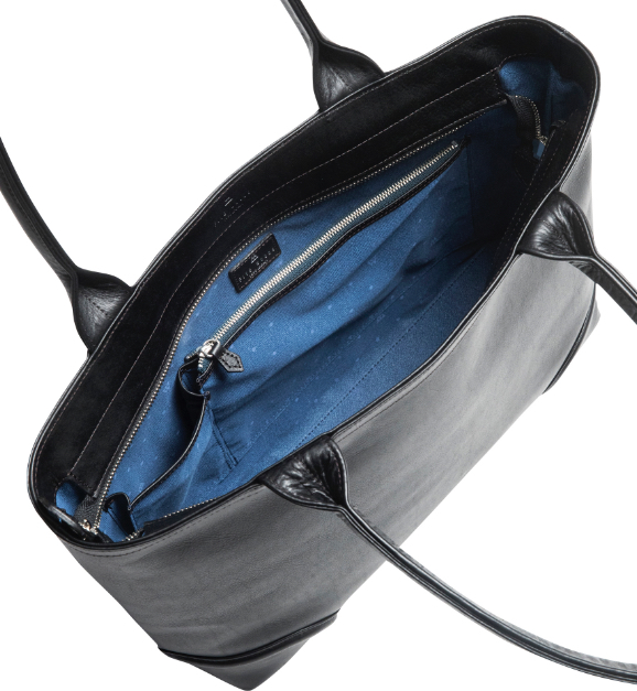 ビジネスツールの収納に適した薄マチ仕立てのレザートート。