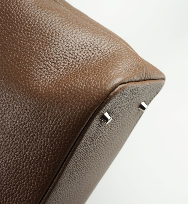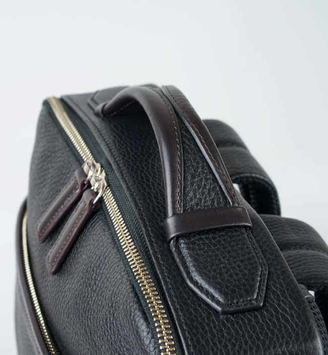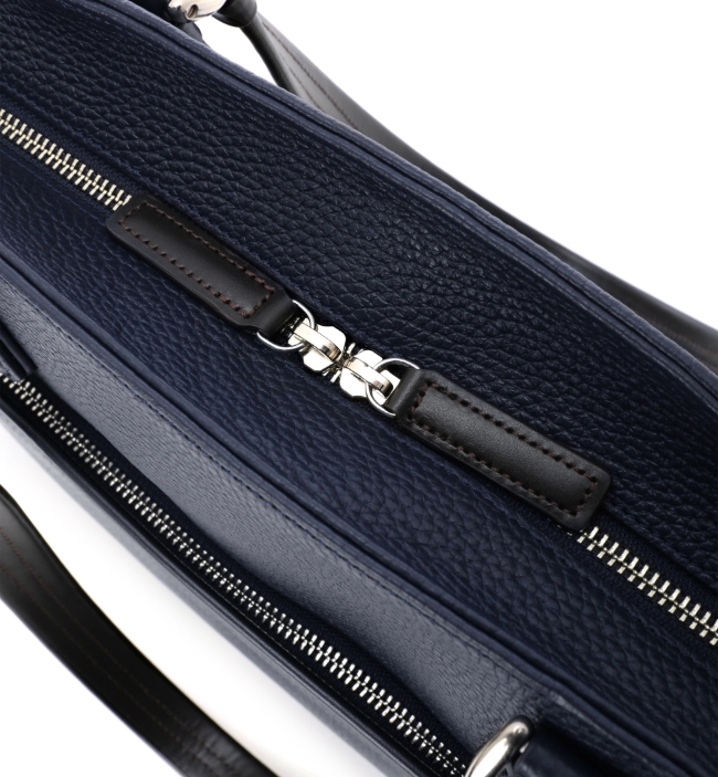 上品なシボを揃えた国産シュリンクレザー。技術力に定評のある姫路のタンナーが手掛けた革は立体的な弾力とハリを持ち、曲げ伸ばしの耐久性にも優れています。表面は傷が目立ちにくく、色落ちや褪色を防ぎ長く使っても上品さをキープする特徴があります。常に触れるハンドルには、部位から厳選した厚口のオイルレザーを採用し耐久性を高めています。使うほどに味わいを増し手に馴染みます。