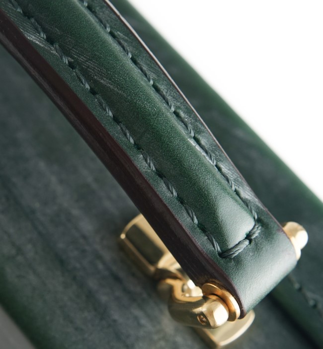 創業160年以上もの歴史を持つ、英国「トーマスウェア&サンズ」社のブライドルレザーを使用。厳選された厚口の欧州原皮だけを用い、数か月の鞣し工程を経て完成する硬く耐久性に優れた素材です。表面にロウや植物性油などを含む固形ワックスを繰り返し塗り込むことで、芯まで浸透したそれらの成分が革の密度を高め強靭さとしなやかさを与えます。古来より馬具に使用されていた事実がその耐久性の高さを証明しています。