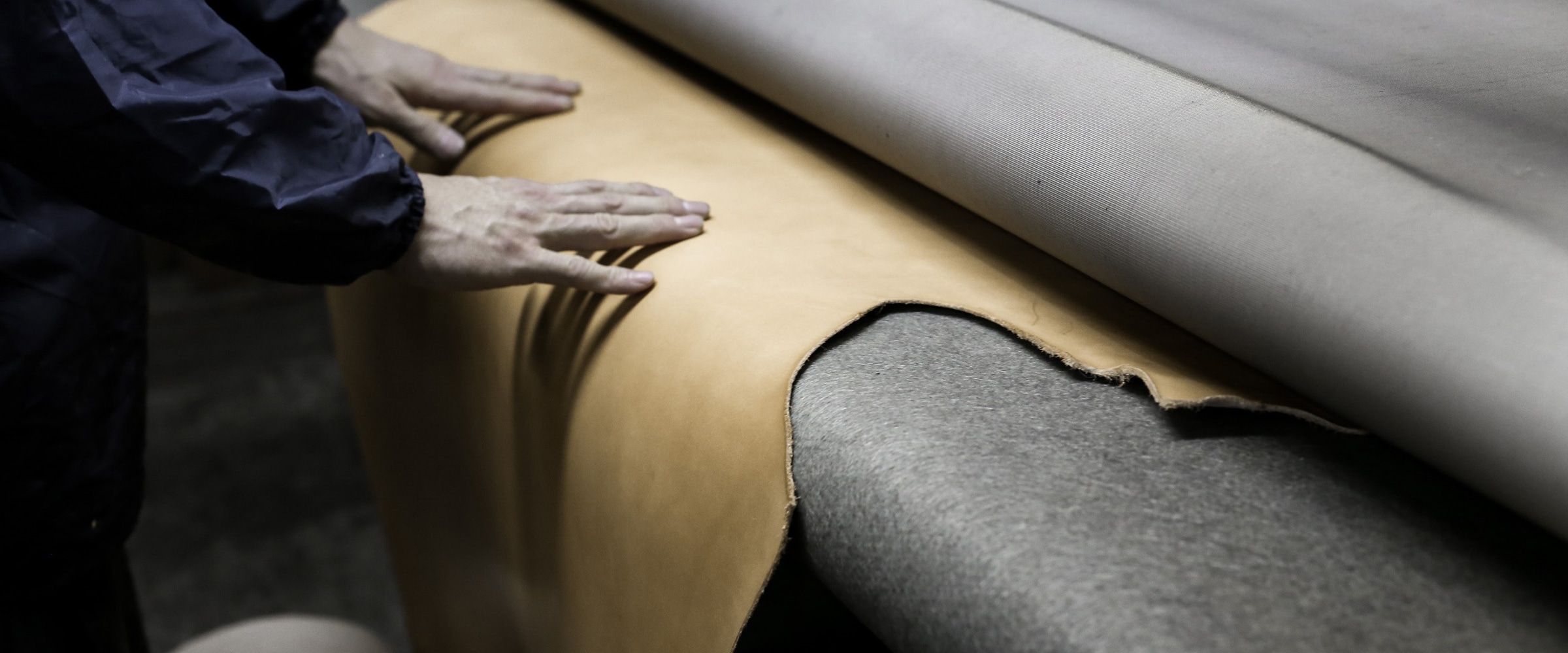 鞣された革の表情をより豊かにするため、アイロンで艶をどの程度出すか、天然の繊維構造による「地シボ」をどのように生かすか、革の表情である「トラ筋」をほぐすとどんな風合いになるのか。こうした作業は、いわば革のお化粧ともなる工程になります。