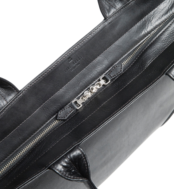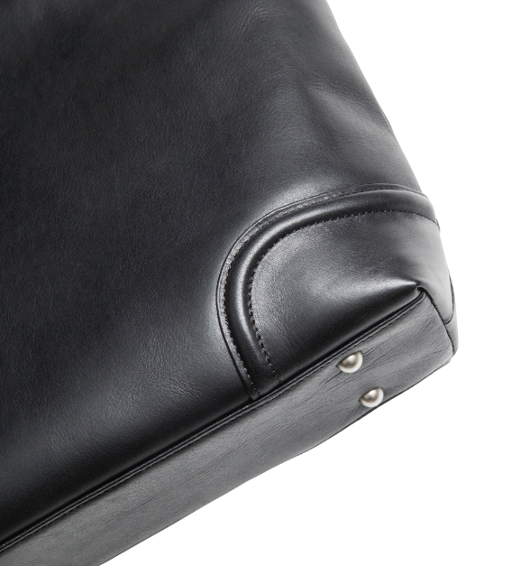 書類やPCが倒れずに収納できるすっきりしたシルエットです。底部は馬具にも用いられる伝統的な補強技法「肉盛り」によって形状をキープし、長期間の使用に耐えられるタフな仕上がり。一枚裁ちの革を折りたたんで作られたこだわりのハンドルは芯材を使わずに手や肩に優しくフィットし、肩からずり落ちにくいのが特徴です。