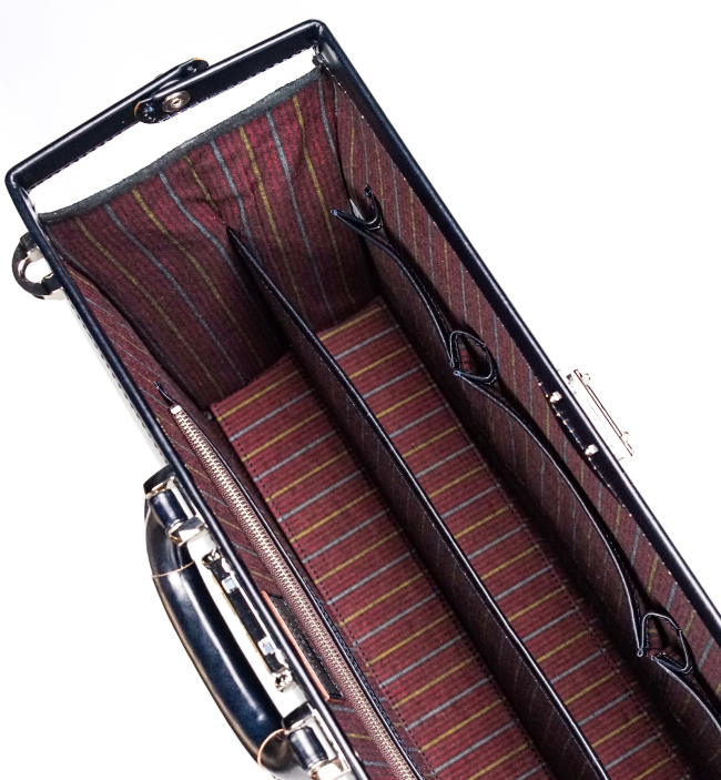 スムーズに開閉されるよう型取りされた独特な丸みは、経験で育まれた確かな技術で優雅なラインが描かれ、他では真似できない圧倒的な重厚感と信頼感も感じさせてくれます。型崩れが起きにくいようにしっかりとクセ付けされ、機能的な仕分けの間仕切りも芯となり、堅牢性が非常に高い仕上がりとなっています。