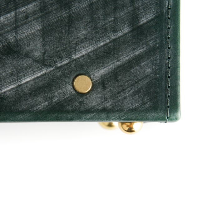 創業160年以上もの歴史を持つ、英国「トーマスウェア&サンズ」社のブライドルレザーを使用。厳選された厚口の欧州原皮だけを用い、数か月の鞣し工程を経て完成する硬く耐久性に優れた素材です。表面にロウや植物性油などを含む固形ワックスを繰り返し塗り込むことで、芯まで浸透したそれらの成分が革の密度を高め強靭さとしなやかさを与えます。古来より馬具に使用されていた事実がその耐久性の高さを証明しています。