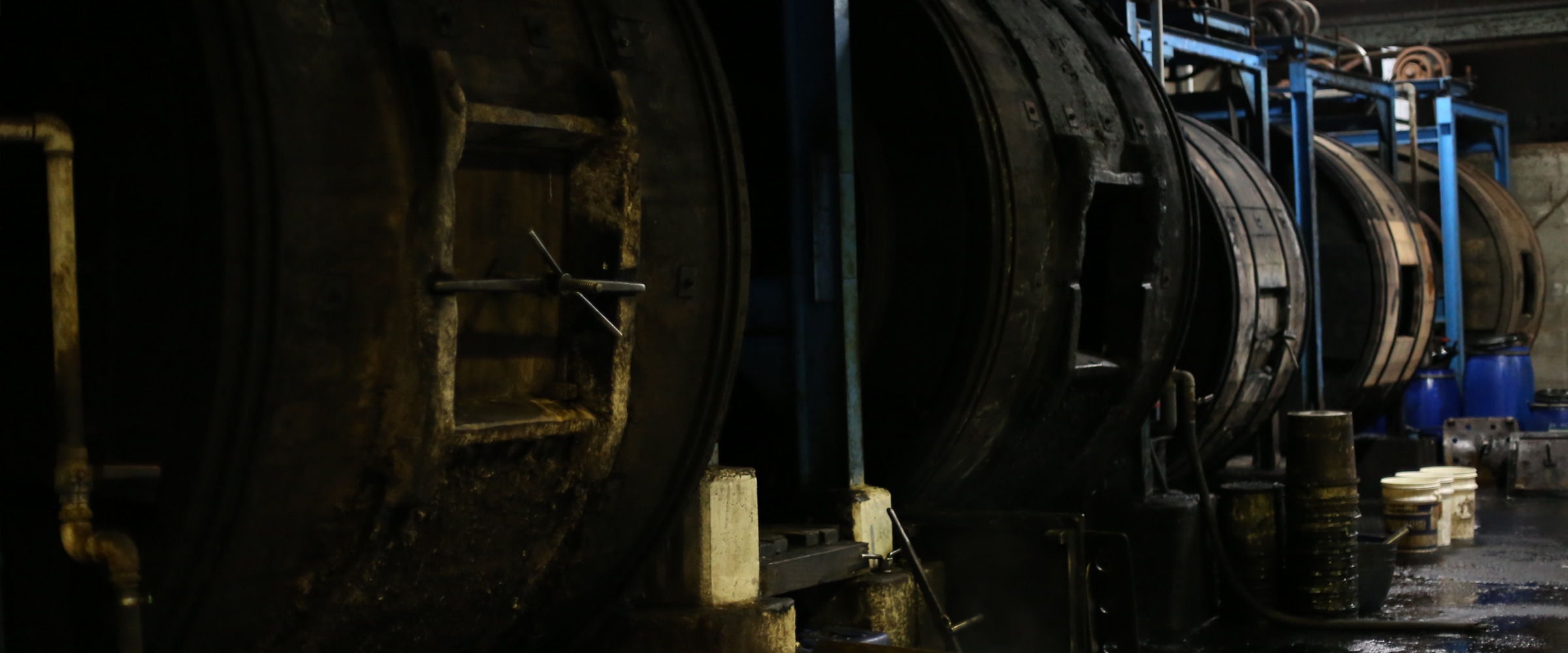 鞣し作業は、「タイコ」と呼ばれる大きな樽の中に原皮と植物の抽出液を入れてかき回すことで染み込ませていきます。しかし、かき回されることで摩擦熱が発生し、抽出液の温度が上がってしまうと「炊き」と呼ばれる状態になり、革の風合いが飛んでしまうのです。そのため、内部の温度が60℃を超えないように常に樽を回す速度を調整しています。